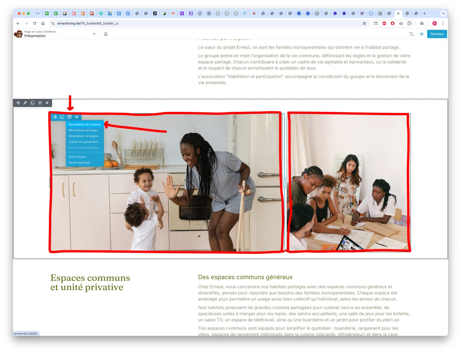 Dans le constructeur de page ouvert, en mode édition, survolez l’icône « Paramètres de colonne » et cliquez sur « Paramètres de colonne ».