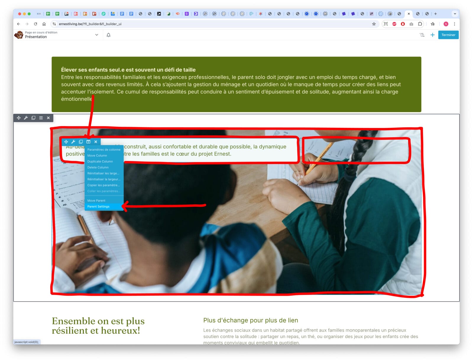 Éditer une photo en arrière plan d’une colonne parent contenant d’autres colonnes.